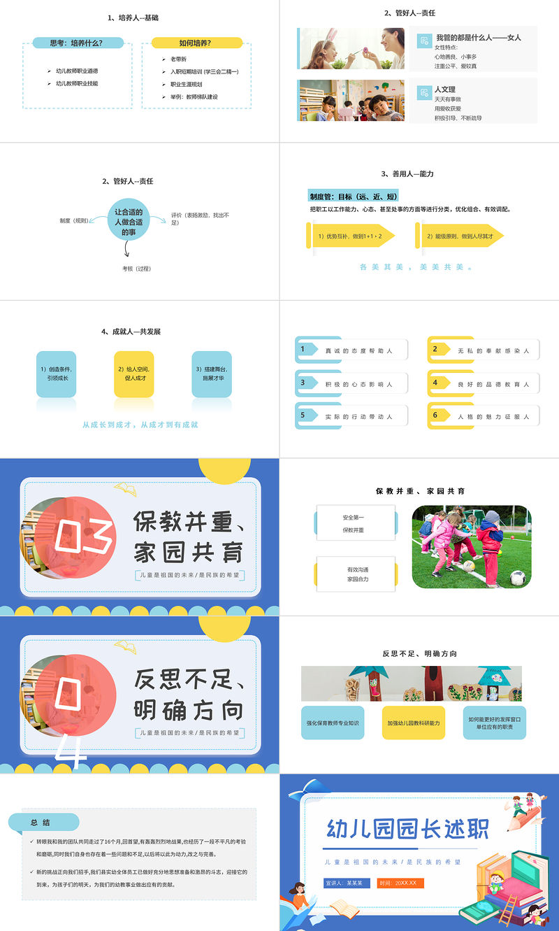 2022幼兒園院長述職PPT藍色簡約風幼兒園園長述職工作匯報工作總結課件模板 Array
