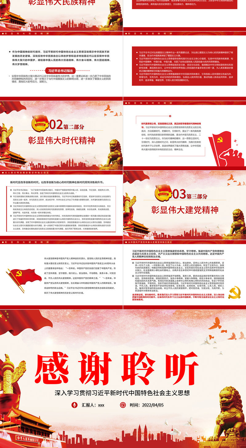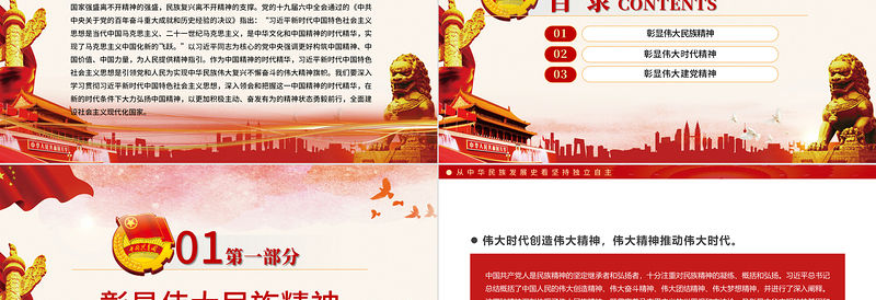 <p></p><br><p>前言導讀/PREFACE國家強盛離不開精神的強盛,民族復興離不開精神的支撐。黨的十九屆六中全會通過的《中共中央關于黨的百年奮斗重大成就和歷史經驗的決議》指出:“習近平新時代中國特色社會主義思想是當代中國馬克思主義、二十一世紀馬克思主義,是中華文化和中國精神的時代精華,實現了馬克思主義中國化新的飛躍。”以習近平同志為核心的黨中央強調更好構筑中國精神、中國價值、中國力量,為人民提供精神指引。作為中國精神的時代精華,習近平新時代中國特色社會主義思想是引領黨和人民為實現中華民族偉大復興不懈奮斗的偉大精神旗幟。我們要深入學習貫徹習近平新時代中國特色社會主義思想,深入領會和把握這一中國精神的時代精華,在新的時代條件下大力弘揚中國精神,以更加積極主動、奮發有為的精神狀態勇毅前行,全面建設社會主義現代化國家。</p><br><p>彰顯偉大民族精神01彰顯偉大時代精神02彰顯偉大建黨精神03目 錄 CONTENTS</p><br><p>01第一部分彰顯偉大民族精神</p><br><p>從中華民族發展史看堅持獨立自主</p><br><p>彰顯偉大民族精神</p><br><p>彰顯偉大民族精神</p><br><p>02第二部分彰顯偉大時代精神</p><br><p>彰顯偉大時代精神</p><br><p>新時代是改革創新的時代,以改革創新為核心的時代精神在新時代得到淬煉和升華。從人類文明發展史看堅持獨立自主</p><br><p>03第三部分彰顯偉大建黨精神</p><br><p>偉大建黨精神是中國共產黨人精神譜系的源頭,是黨和人民的寶貴精神財富,具有重大理論意義和現實意義。習近平總書記在慶祝中國共產黨成立100周年大會上的重要講話中指出:“一百年前,中國共產黨的先驅們創建了中國共產黨,形成了堅持真理、堅守理想,踐行初心、擔當使命,不怕犧牲、英勇斗爭,對黨忠誠、不負人民的偉大建黨精神,這是中國共產黨的精神之源。”“一百年來,中國共產黨弘揚偉大建黨精神,在長期奮斗中構建起中國共產黨人的精神譜系,錘煉出鮮明的政治品格。”習近平總書記對偉大建黨精神的提煉總結和深刻闡述,揭示了偉大建黨精神的歷史意義和時代價值。彰顯偉大建黨精神</p><br><p>習近平新時代中國特色社會主義思想強調堅持真理、堅守理想,強調中國共產黨的理想信念就是馬克思主義信仰、共產主義遠大理想和中國特色社會主義共同理想,這是中國共產黨人的精神支柱和政治靈魂。習近平新時代中國特色社會主義思想強調踐行初心、擔當使命,堅持以人民為中心的發展思想,堅持一切為了人民、一切依靠人民,彰顯了以人為本、人民至上的價值取向,彰顯了立黨為公、執政為民的執政理念;明確堅持和發展中國特色社會主義,總任務是實現社會主義現代化和中華民族偉大復興,在全面建成小康社會的基礎上,分兩步走在本世紀中葉建成富強民主文明和諧美麗的社會主義現代化強國。習近平新時代中國特色社會主義思想強調不怕犧牲、英勇斗爭,要求總結運用好黨積累的偉大斗爭經驗,堅持底線思維,增強憂患意識,發揚斗爭精神,掌握斗爭策略,練就斗爭本領,保持越是艱險越向前的大無畏氣概,有效應對前進道路上各種可以預料和難以預料的風險挑戰,彰顯了中華民族不畏強敵、不懼風險、百折不撓的風骨和品質。習近平新時代中國特色社會主義思想強調對黨忠誠、不負人民,要求黨員干部堅持在黨愛黨、在黨言黨、在黨憂黨、在黨為黨,心系人民、情系人民,錘煉對黨忠誠的政治品格,樹立不負人民的家國情懷,把對黨忠誠、為黨分憂、為黨盡職、為民造福作為根本政治擔當。從中國共產黨百年奮斗史看堅持獨立自主奮進新征程、建功新時代,要求我們深入學習貫徹習近平新時代中國特色社會主義思想,深入領會和把握中國精神的時代精華,在新的時代條件下大力弘揚中國精神,不斷奪取全面建設社會主義現代化國家新勝利。</p><br><p>匯報人:xxx時間:2022/04/05感謝聆聽深入學習貫徹習近平新時代中國特色社會主義思想</p><br>