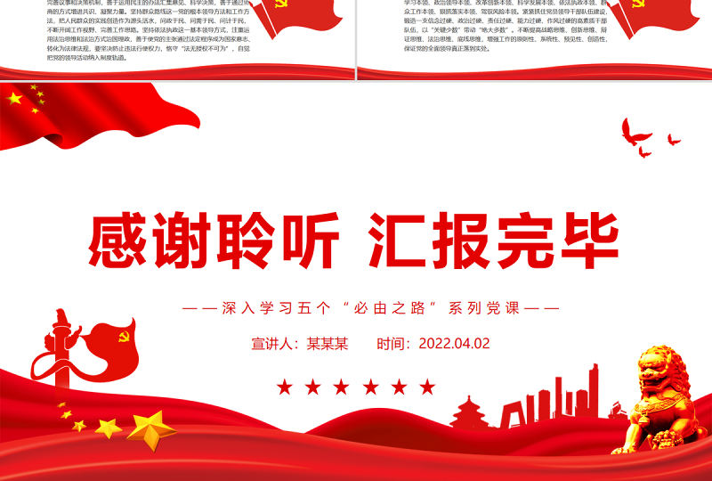 <p>宣講人:某某某 時間:2022.04.02——深入學習五個“必由之路”系列黨課——走好“五個必由之路”之堅持黨的全面領導</p><br><p>習近平總書記在參加十三屆全國人大五次會議內蒙古代表團審議時,站在黨和國家事業發展全局的戰略高度,回顧新時代黨和人民奮進歷程,精辟概括了這一歷程中形成的“五個必由之路”重要認識。“五個必由之路”的重要認識閃耀著馬克思主義的真理光芒,體現了新時代中國共產黨人堅定的歷史自信、強烈的責任擔當,為我們奮進新征程、再創新輝煌指明了方向。中國共產黨領導是中國特色社會主義最本質的特征。“堅持黨的全面領導是堅持和發展中國特色社會主義的必由之路”居于“五個必由之路”之首,是我們系統理解、深刻把握這一重要論斷的關鍵點。前 言</p><br><p></p><br><p>堅持黨的全面領導這條必由之路是歷史的選擇</p><br><p>堅持黨的全面領導這條必由之路是歷史的選擇始終把為中國人民謀幸福、為中華民族謀復興作為自己的初心和使命。我們黨團結帶領人民經過艱苦卓絕的土地革命戰爭、抗日戰爭、解放戰爭,推翻了壓在中國人民頭上的“三座大山”,建立了人民當家作主的中華人民共和國,開啟了中華民族發展進步的新紀元。中國人民從此站起來了,中華民族任人宰割、飽受欺凌的時代一去不復返了。新中國成立后,盡管探索之路艱辛坎坷,但我們成功建立和鞏固了社會主義基本制度,建立了獨立的、比較完整的工業體系和國民經濟體系,為人民幸福、民族復興奠定了根本制度基礎和物質基礎。</p><br><p>堅持黨的全面領導這條必由之路是歷史的選擇我們黨以經濟建設為中心、堅持四項基本原則、堅持改革開放,成功開創中國特色社會主義。習近平總書記強調,改革開放是黨的一次偉大覺醒,是中國人民和中華民族發展史上一次偉大革命,發出將改革開放進行到底的偉大號召。改革開放和社會主義現代化建設的偉大成就舉世矚目,我國實現了從生產力相對落后的狀況到經濟總量躍居世界第二的歷史性突破,實現了人民生活從溫飽不足到總體小康、奔向全面小康的歷史性跨越,推進了中華民族從站起來到富起來的偉大飛躍,中國大踏步趕上了時代。</p><br><p>堅持黨的全面領導這條必由之路是歷史的選擇中國特色社會主義進入新時代。面對世界復雜多變的形勢和國內繁重艱巨的改革發展任務,面對各種重大風險考驗和黨內存在的突出問題,以習近平同志為核心的黨中央舉旗亮劍、銳意進取,統籌推進“五位一體”總體布局,協調推進“四個全面”戰略布局,以深化改革增添發展動力,以高壓反腐凈化政治生態,以脫貧攻堅解決突出民生問題,解決了許多長期想解決而沒有解決的難題,辦成了許多過去想辦而沒有辦成的大事,黨和國家事業取得歷史性成就、發生歷史性變革,充分彰顯了習近平新時代中國特色社會主義思想的實踐偉力、中國特色社會主義制度的巨大優勢、中國共產黨的強大執政能力。</p><br><p>堅持黨的全面領導這條必由之路是人民的選擇</p><br><p>我們黨始終代表最廣大人民群眾利益。堅持黨的全面領導這條必由之路是人民的選擇中國共產黨是全心全意為人民服務的政黨,沒有自己特殊的利益。自成立之日起,我們黨始終把人民放在心中最高位置。延安時期,面對“歷史周期率”的提問,毛澤東同志指出:“我們已經找到新路,我們能跳出這周期率。這條新路,就是民主,只有讓人民來監督政府,政府才不敢松懈。只有人人起來負責,才不會人亡政息?!绷暯娇倳洀娬{:“為中國人民謀幸福,為中華民族謀復興,是中國共產黨人的初心和使命,是激勵一代代中國共產黨人前赴后繼、英勇奮斗的根本動力?!卑倌陮嵺`告訴我們,我們黨始終代表最廣大人民根本利益,黨與人民風雨同舟、生死與共,始終保持血肉聯系,是黨戰勝一切困難和風險的根本保證。</p><br><p>我們黨永遠是人民最可靠的主心骨。堅持黨的全面領導這條必由之路是人民的選擇歷史實踐證明:黨始終是人民最可靠的主心骨。面對新冠肺炎疫情,在人民生命安全和身體健康受到嚴重威脅的危急關頭,我們黨帶領全國人民打響了一場氣壯山河的抗擊疫情人民戰爭、總體戰、阻擊戰。當前,百年變局和世紀疫情相互交織,經濟全球化遭遇逆流,世界進入新的動蕩變革期,國內改革發展穩定任務艱巨繁重。實現第二個百年奮斗目標,不斷推進民族復興偉大事業,更加需要鑄牢黨的領導這個黨和國家事業不斷發展的“定海神針”,為做好黨和國家各項工作提供根本保證。</p><br><p>堅持黨的全面領導這條必由之路是人民的選擇中國共產黨是全心全意為人民服務的政黨,沒有自己特殊的利益。自成立之日起,我們黨始終把人民放在心中最高位置。延安時期,面對“歷史周期率”的提問,毛澤東同志指出:“我們已經找到新路,我們能跳出這周期率。這條新路,就是民主,只有讓人民來監督政府,政府才不敢松懈。只有人人起來負責,才不會人亡政息?!绷暯娇倳洀娬{:“為中國人民謀幸福,為中華民族謀復興,是中國共產黨人的初心和使命,是激勵一代代中國共產黨人前赴后繼、英勇奮斗的根本動力?!卑倌陮嵺`告訴我們,我們黨始終代表最廣大人民根本利益,黨與人民風雨同舟、生死與共,始終保持血肉聯系,是黨戰勝一切困難和風險的根本保證。</p><br><p>堅持黨的全面領導這條必由