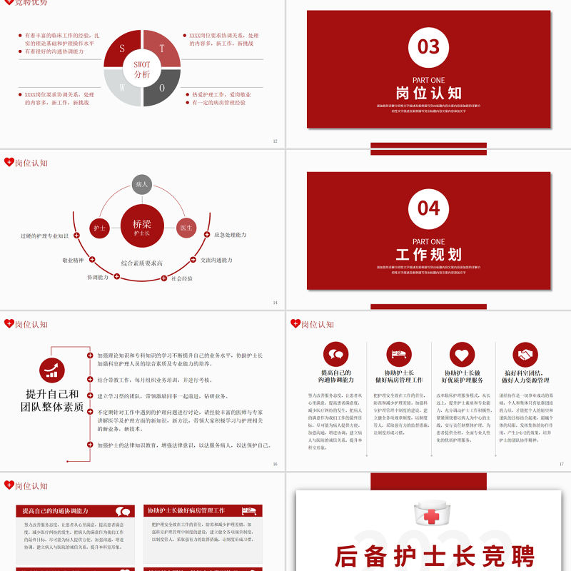 競聘優勢STOWSWOT分析熱愛護理工作,愛崗敬業有一定的病房管理經驗有著豐富的臨床工作的經驗,扎實的理論基礎和護理操作水平有著很好的溝通協調能力XXXX崗位要求協調關系,處理的內容多,新工作,新挑戰XXXX崗位要求協調關系,處理的內容多,新工作,新挑戰