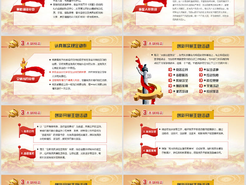 3活動內容認真抓實規定動作創新開展主題活動組織集中學習集體誦讀黨章重溫入黨誓詞交納當月黨費廉政教育民主議事紅色教育崗位競賽黨務公開志愿服務業務培訓文體活動組織生活扶貧攻堅
