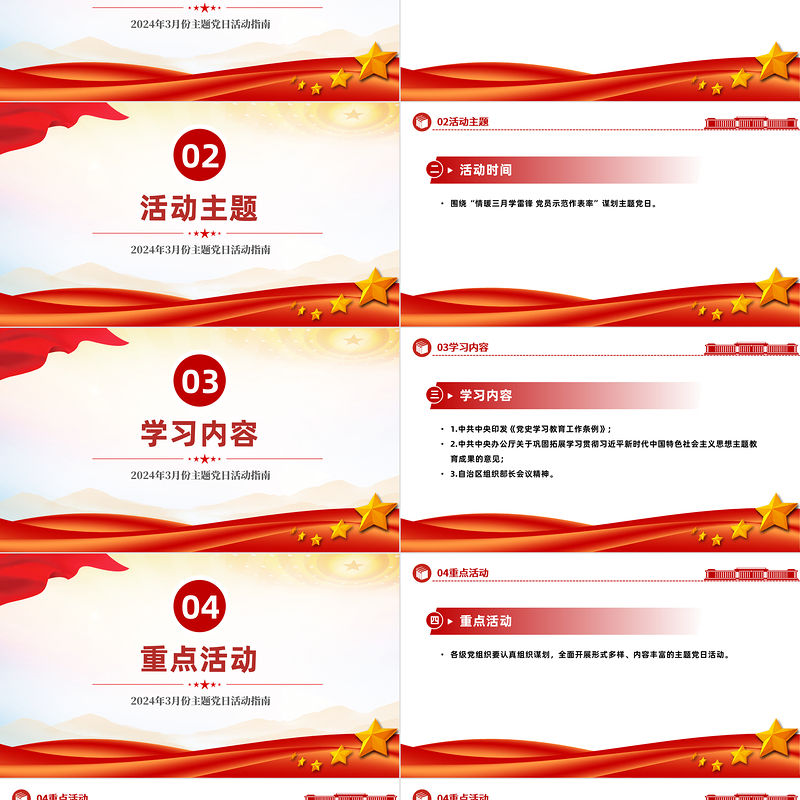 04重點活動重點活動各級黨組織要認真組織謀劃,全面開展形式多樣、內容豐富的主題黨日活動。