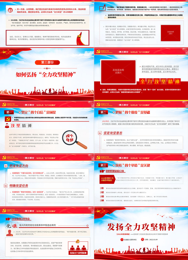 發(fā)揚全力攻堅精神PPT紅色大氣2022年黨政黨建黨組支部微黨課課件模板下載