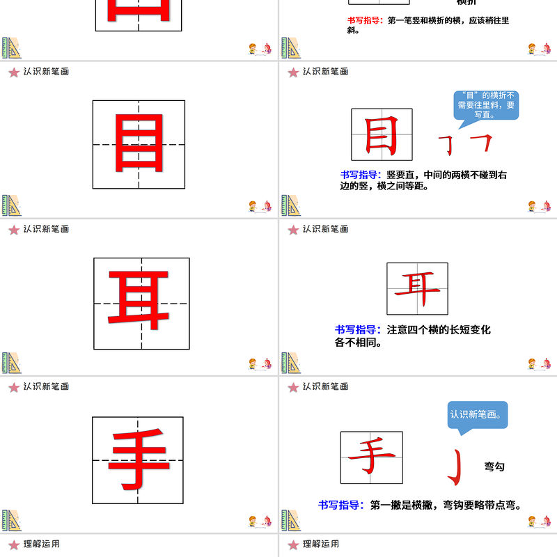 書寫指導:第一筆豎和橫折的橫,應該稍往里斜。橫折認識新筆畫。
