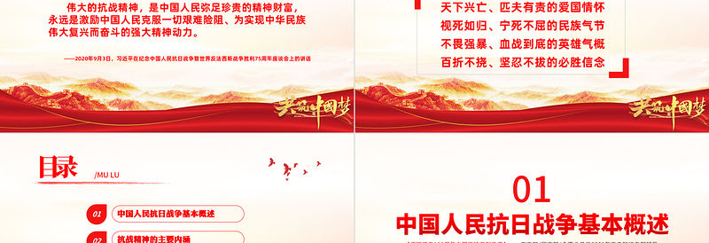 偉大的抗戰精神,是中國人民彌足珍貴的精神財富,永遠是激勵中國人民克服一切艱難險阻、為實現中華民族偉大復興而奮斗的強大精神動力。 ——2020年9月3日,習近平在紀念中國人民抗日戰爭暨世界反法西斯戰爭勝利75周年座談會上的講話前 言/QIAN YAN