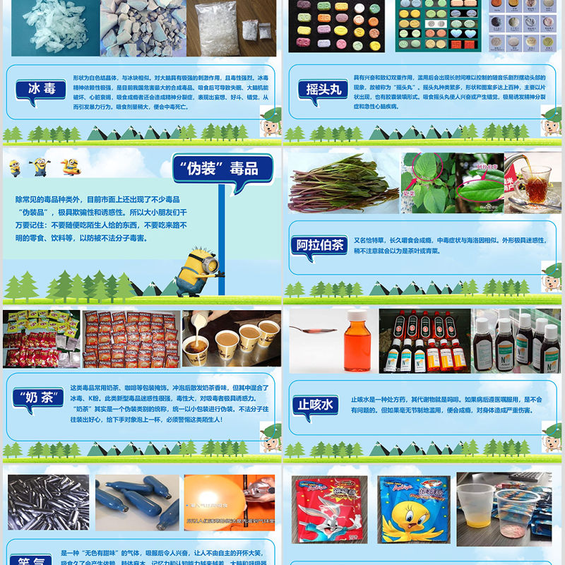 “偽裝”毒品除常見的毒品種類外,目前市面上還出現了不少毒品“偽裝品”,極具欺騙性和誘惑性。所以大小朋友們千萬要記住:不要隨便吃陌生人給的東西,不要吃來路不明的零食、飲料等,以防被不法分子毒害。
