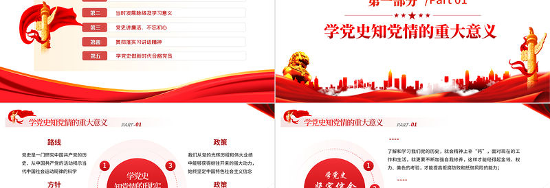 PART-01學黨史知黨情的重大意義學黨史知黨情的現實意義3412我們從黨的光輝歷程和偉大業績中能夠獲得繼往開來的強大動力,始終堅定中國特色社會主義信念通過研究黨史才能更加準確地認識到黨的偉大。通過長期奮斗形成的光榮傳統和寶貴經驗是中國共產黨走向輝煌的基礎黨史是一門研究中國共產黨的歷史、從中國共產黨的活動揭示當代中國社會運動規律的科學國史是研究黨的路線、方針、政策如何貫徹,經濟、文化、社會、外交、國防等各項事業如何發展的歷史。黨史是國史的核心,黨史走向決定國史走向路線方針政策政策