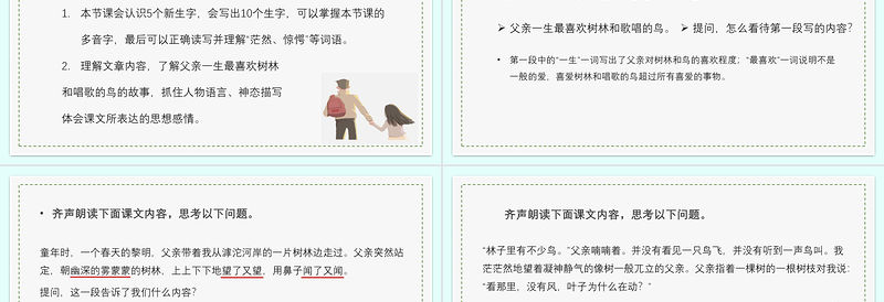父親一生最喜歡樹林和歌唱的鳥。提問,怎么看待第一段寫的內容?第一段中的“一生”一詞寫出了父親對樹林和鳥的喜歡程度;“最喜歡”一詞說明不是一般的愛,喜愛樹林和唱歌的鳥超過所有喜愛的事物。齊聲朗讀下面課文內容,思考以下問題。