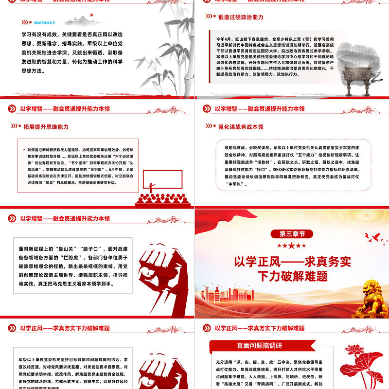 面對新征程上的“婁山關”“臘子口”,面對戰建備各領域各方面的“攔路虎”,各部門各單位勇于破除思維觀念的桎梏,跳出條條框框的束縛,用黨的創新理論改造主觀世界、增強履職本領、指導推動實踐,真正把馬克思主義看家本領學到手。以學增智——融會貫通提升能力本領