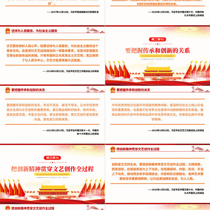 <p>推動文藝創(chuàng)新 相關(guān)領(lǐng)導(dǎo)提出這些要求</p><br><p>02要把握傳承和創(chuàng)新的關(guān)系03把創(chuàng)新精神貫穿文藝創(chuàng)作全過程04中西合璧、融會貫通目錄0105堅(jiān)持為人民服務(wù)、為社會主義服務(wù)把文藝隊(duì)伍建設(shè)擺在更加突出的重要位置</p><br><p>第一部分COMMUNIST PARTY OF CHINA堅(jiān)持為人民服務(wù)、為社會主義服務(wù)</p><br><p>堅(jiān)持為人民服務(wù)、為社會主義服務(wù)——2017年11月21日,習(xí)近平回信勉勵(lì)烏蘭牧騎隊(duì)員烏蘭牧騎的長盛不衰表明,人民需要藝術(shù),藝術(shù)也需要人民。在新時(shí)代,希望你們以黨的十九大精神為指引,大力弘揚(yáng)烏蘭牧騎的優(yōu)良傳統(tǒng),扎根生活沃土,服務(wù)牧民群眾,推動文藝創(chuàng)新,努力創(chuàng)作更多接地氣、傳得開、留得下的優(yōu)秀作品,永遠(yuǎn)做草原上的“紅色文藝輕騎兵”。</p><br><p>堅(jiān)持為人民服務(wù)、為社會主義服務(wù)——2016年11月30日,習(xí)近平在中國文聯(lián)十大、中國作協(xié)九大開幕式上的講話廣大文藝工作者要堅(jiān)持以人民為中心的創(chuàng)作導(dǎo)向,堅(jiān)持為人民服務(wù)、為社會主義服務(wù),堅(jiān)持百花齊放、百家爭鳴,堅(jiān)持創(chuàng)造性轉(zhuǎn)化、創(chuàng)新性發(fā)展,高擎民族精神火炬,吹響時(shí)代前進(jìn)號角,把藝術(shù)理想融入黨和人民事業(yè)之中,做到胸中有大義、心里有人民、肩頭有責(zé)任、筆下有乾坤,推出更多反映時(shí)代呼聲、展現(xiàn)人民奮斗、振奮民族精神、陶冶高尚情操的優(yōu)秀作品,為我們的人民昭示更加美好的前景,為我們的民族描繪更加光明的未來。</p><br><p>堅(jiān)持為人民服務(wù)、為社會主義服務(wù)——2014年10月15日,習(xí)近平在文藝工作座談會上的講話文藝要反映好人民心聲,就要堅(jiān)持為人民服務(wù)、為社會主義服務(wù)這個(gè)根本方向。這是黨對文藝戰(zhàn)線提出的一項(xiàng)基本要求,也是決定我國文藝事業(yè)前途命運(yùn)的關(guān)鍵。只有牢固樹立馬克思主義文藝觀,真正做到了以人民為中心,文藝才能發(fā)揮最大正能量。</p><br><p>第二部分COMMUNIST PARTY OF CHINA要把握傳承和創(chuàng)新的關(guān)系</p><br><p>要把握傳承和創(chuàng)新的關(guān)系——2021年12月14日,習(xí)近平在中國文聯(lián)十一大、中國作協(xié)十大開幕式上的講話要把握傳承和創(chuàng)新的關(guān)系,學(xué)古不泥古、破法不悖法,讓中華優(yōu)秀傳統(tǒng)文化成為文藝創(chuàng)新的重要源泉。要正確運(yùn)用新的技術(shù)、新的手段,激發(fā)創(chuàng)意靈感、豐富文化內(nèi)涵、表達(dá)思想情感,使文藝創(chuàng)作呈現(xiàn)更有內(nèi)涵、更有潛力的新境界。</p><br><p>要把握傳承和創(chuàng)新的關(guān)系——2014年10月15日,習(xí)近平在文藝工作座談會上的講話中華優(yōu)秀傳統(tǒng)文化是中華民族的精神命脈,是涵養(yǎng)社會主義核心價(jià)值觀的重要源泉,也是我們在世界文化激蕩中站穩(wěn)腳跟的堅(jiān)實(shí)根基。要結(jié)合新的時(shí)代條件傳承和弘揚(yáng)中華優(yōu)秀傳統(tǒng)文化,傳承和弘揚(yáng)中華美學(xué)精神。</p><br><p>第三部分COMMUNIST PARTY OF CHINA把創(chuàng)新精神貫穿文藝創(chuàng)作全過程</p><br><p>把創(chuàng)新精神貫穿文藝創(chuàng)作全過程——2016年11月30日,習(xí)近平在中國文聯(lián)十大、中國作協(xié)九大開幕式上的講話創(chuàng)新是文藝的生命。要把創(chuàng)新精神貫穿文藝創(chuàng)作全過程,大膽探索,銳意進(jìn)取,在提高原創(chuàng)力上下功夫,在拓展題材、內(nèi)容、形式、手法上下功夫,推動觀念和手段相結(jié)合、內(nèi)容和形式相融合、各種藝術(shù)要素和技術(shù)要素相輝映,讓作品更加精彩紛呈、引人入勝。</p><br><p>把創(chuàng)新精神貫穿文藝創(chuàng)作全過程——2014年10月15日,習(xí)近平在文藝工作座談會上的講話文藝創(chuàng)作是觀念和手段相結(jié)合、內(nèi)容和形式相融合的深度創(chuàng)新,是各種藝術(shù)要素和技術(shù)要素的集成,是胸懷和創(chuàng)意的對接。要把創(chuàng)新精神貫穿文藝創(chuàng)作生產(chǎn)全過程,增強(qiáng)文藝原創(chuàng)能力。要堅(jiān)持百花齊放、百家爭鳴的方針,發(fā)揚(yáng)學(xué)術(shù)民主、藝術(shù)民主,營造積極健康、寬松和諧的氛圍,提倡不同觀點(diǎn)和學(xué)派充分討論,提倡體裁、題材、形式、手段充分發(fā)展,推動觀念、內(nèi)容、風(fēng)格、流派切磋互鑒。</p><br><p>第四部分COMMUNIST PARTY OF CHINA中西合璧、融會貫通</p><br><p>中西合璧、融會貫通——2016年11月30日,習(xí)近平在中國文聯(lián)十大、中國作協(xié)九大開幕式上的講話當(dāng)代中國正經(jīng)歷著我國歷史上最為廣泛而深刻的社會變革,也正在進(jìn)行著人類歷史上最為宏大而獨(dú)特的實(shí)踐創(chuàng)新。這種偉大實(shí)踐必將給文化創(chuàng)新創(chuàng)造提供強(qiáng)大動力和廣闊空間。廣大文藝工作者要努力創(chuàng)作同我們這個(gè)文明古國、我們這個(gè)蓬勃發(fā)展的國家相匹配的優(yōu)秀作品。中國人民不僅將為人類貢獻(xiàn)新的發(fā)展模式、發(fā)展道路,而且將把自己在文化創(chuàng)新創(chuàng)造中取得的成果奉獻(x