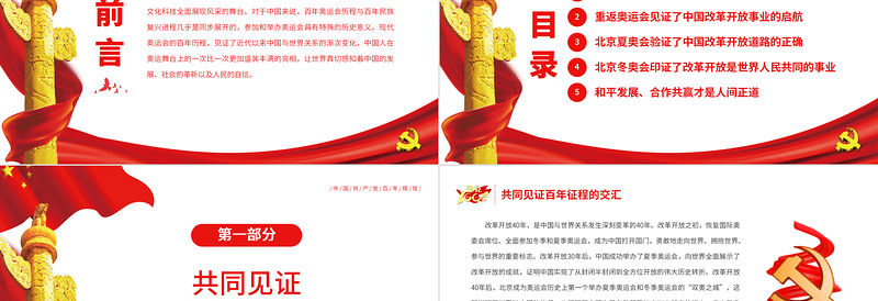 目錄/中/國/共/產/黨/百/年/輝/煌/共同見證百年征程的交匯重返奧運會見證了中國改革開放事業的啟航北京夏奧會驗證了中國改革開放道路的正確123北京冬奧會印證了改革開放是世界人民共同的事業和平發展、合作共贏才是人間正道45
