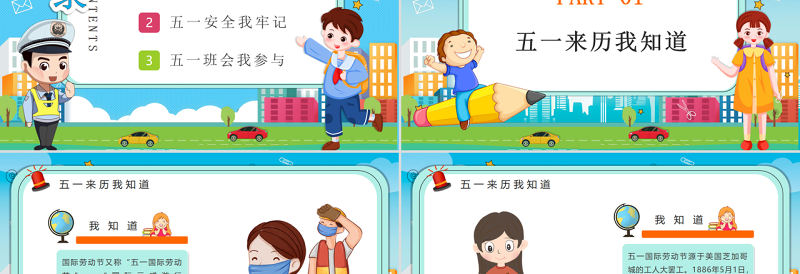 清新勞動節學生假期安全教育主題班會介紹PPT模板 Array