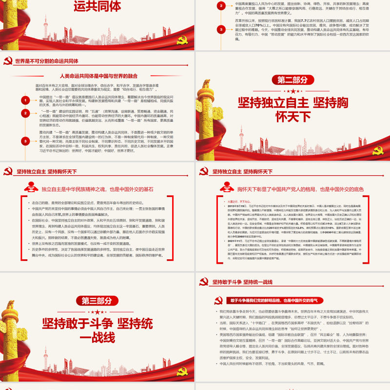 工圖網提供中國特色大國外交的鮮明旗幟PPT紅色簡約風黨員干部深入學習《決議》專題黨課課件模板供會員免費下載。更多精彩黨課PPT素材,盡在工圖網。