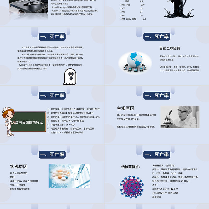 一、死亡率 目前全球疫情 全球有三分之一的人(約20億)曾受到結(jié)核 分枝桿菌的感染 WHO把印度、中國(guó)、俄羅斯、南非、秘魯?shù)?22個(gè)國(guó)家列為結(jié)核病高負(fù)擔(dān)、高危險(xiǎn)性國(guó)家