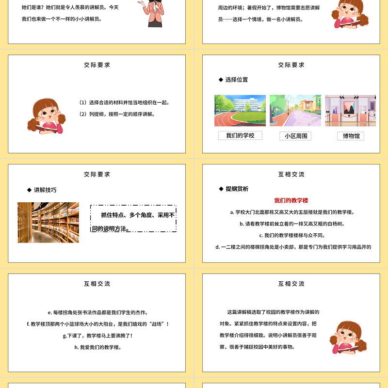 小學學科網 xuekeedu.com對講解員的要求(1)講解的時候,條理要清楚,講解的語氣、語速要適當,還可以用手勢、動作、表情幫助講解。 (2)為了使講解更吸引人,可以把要講的內容做成小展板,畫出參觀路線,附上注解;還可以在講的時候配上圖片、影像或者音樂。互相交流