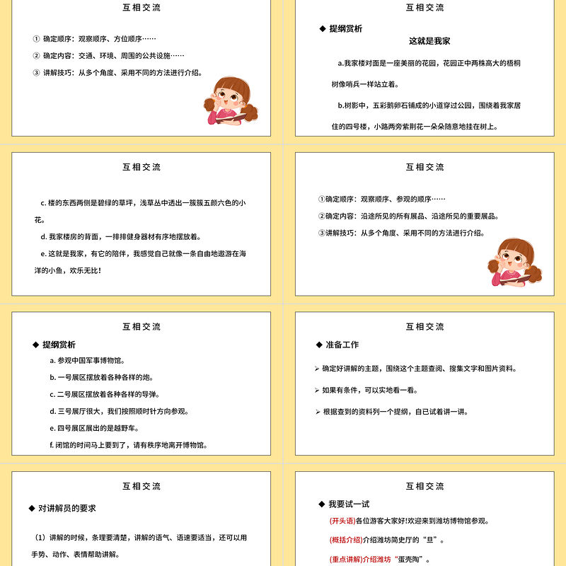 確定好講解的主題,圍繞這個主題查閱、搜集文字和圖片資料。如果有條件,可以實地看一看。根據查到的資料列一個提綱,自已試著講一講。準備工作互相交流
