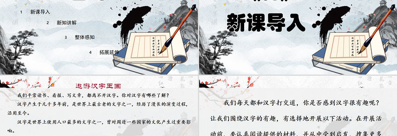 我們平常讀書、看報、寫文章,都離不開漢字。你對漢字有哪些了解? 漢字產生于幾千多年前,是世界上最古老的文字之一,經歷了漫長的演變過程,沿用至今。 漢字是世界上使用人口最多的文字之一,曾對周邊一些國家的文化產生過重要影響。 漢字書法是一門獨特的藝術。古往今來,我國涌現出了許多著名的書法家,他們的書法作品是藝術中的珍品。 …… 你一定想更多地了解漢字吧!讓我們開展綜合性學習活動,一起遨游漢字王國,感受漢字的趣味,了解漢字文化,并為漢字的規范使用做一些力所能及的事情。遨游漢字王國