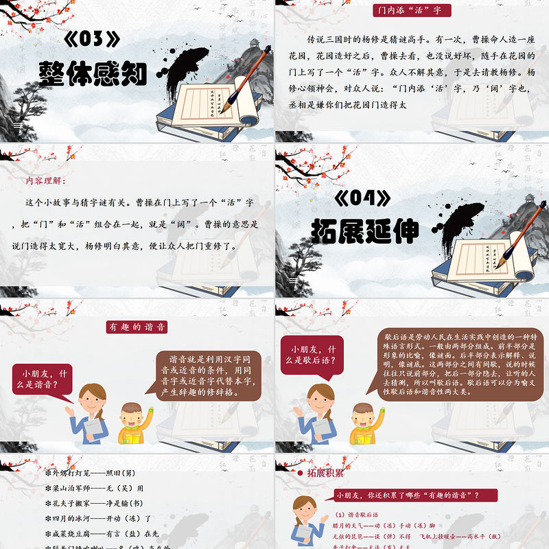 內容理解: 這個小故事與猜字謎有關。曹操在門上寫了一個“活”字,把“門”和“活”組合在一起,就是“闊”。曹操的意思是說門造得太寬大,楊修明白其意,便讓眾人把門重修了。
