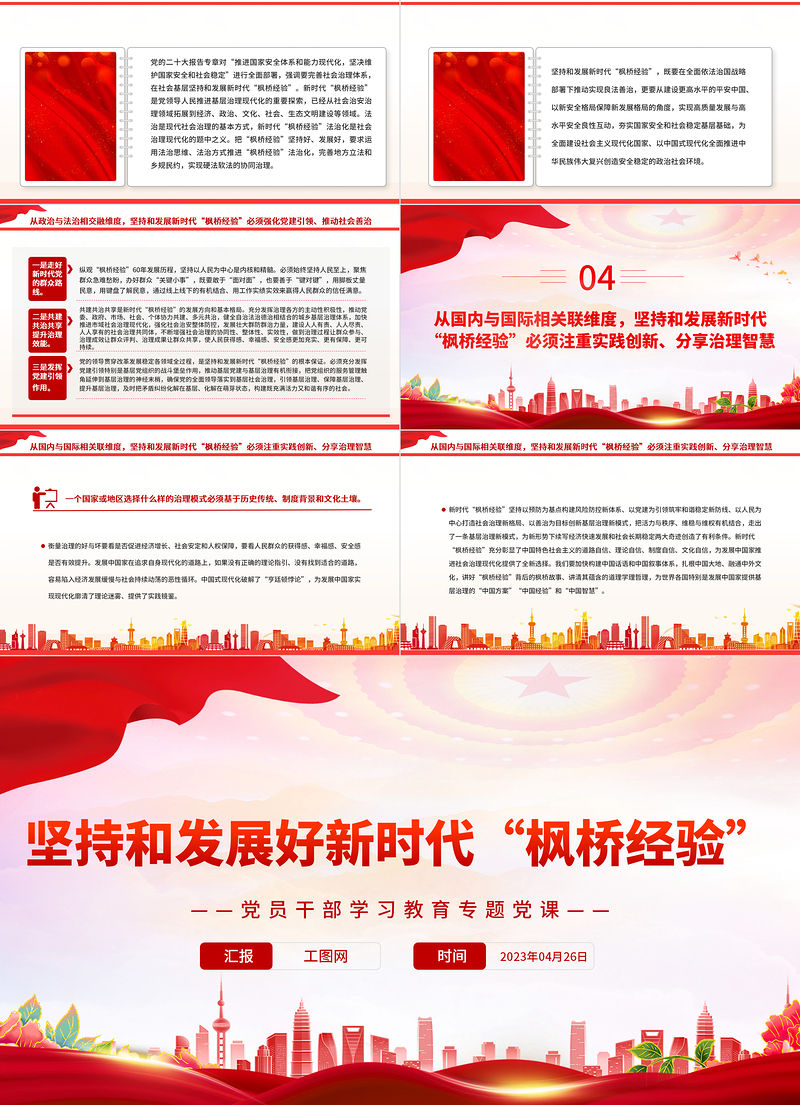 工圖網(wǎng)提供2023堅持和發(fā)展好新時代“楓橋經(jīng)驗”PPT大氣精美風黨員干部學(xué)習(xí)教育專題黨課課件供會員免費下載。更多精彩黨課PPT素材,盡在工圖網(wǎng)。