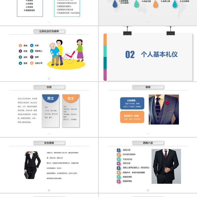 10莊重大方,顏色控制在三色之內,建議深色西裝外套,純色襯衣,顏色以淡雅為主。無袖裝只出現(xiàn)在商務宴會中,無袖連衣裙,加外套或披巾。但記住刮掉你的腋毛。正式的商務場合,無論什么季節(jié),商務套裝必須是長袖的。女生著裝