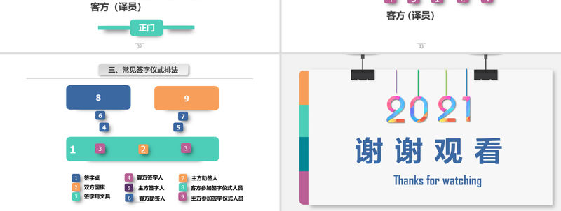 三、常見簽字儀式排法1簽字桌2雙方國旗3簽字用文具4客方簽字人5主方簽字人6789客方助簽人主方助簽人客方參加簽字儀式人員主方參加簽字儀式人員