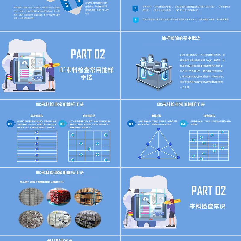 <p>實用IQC基礎知識培訓課件培訓:辦圖網 時間:20XX年X月X日</p><br><p>CONTENT目錄1進料檢驗機構的主要工作任務 2抽樣檢驗的基本概念 3IQC來料檢查常用抽樣手法4來料檢查常識5IQC來料檢查常見不良點綜述</p><br><p>進料檢驗機構的主要工作任務 PART 01</p><br><p>進料檢驗機構的主要工作任務1234負責監督供方提供相關部件和原材料的《質量保證書》、《環境物質管理報告》及《出貨檢驗報告》;熟知所檢驗產品的標準、圖紙、工藝、檢驗文件;嚴格按照《進料檢驗工作規范》對來料的檢驗項目進行逐一檢驗,檢驗合格后做好檢驗狀態標識,并認真做好《進料檢驗報告》質量記錄;及對所驗物料進行稱重,并做好稱重記錄。檢驗合格的物料,將已檢驗完畢的樣本用原包裝封好后歸位,然后在物料外箱顯著位置上貼附“PASS”標簽。</p><br><p>進料檢驗機構的主要工作任務檢驗不合格的物料,填寫《來料品質異常單》和《來料檢驗報告》以及不良樣品一起交由品保工程師&品保主管進行確認,判定不合格后,在物料外包裝的顯著位置加貼“NG”標簽,同時通知倉庫人員將其移至不合格品區隔離;當處理結果需MRB評審時,PMC部發出物料評審會議, 開立《物料評審報告》通知MRB小組協商決策.及時處理和確認因為漏檢和誤檢產生的質量問題流入下一工站,并做好相應的記錄,預防重復出現.參考資料:《IQA進料檢驗規范》,《IQC電子類&塑膠&五金&包材進料檢驗標準》,《MRB處理流程規范》,《進料檢驗控制程序》,《GB/T2828-2003抽樣表》.</p><br><p>IQC來料檢查常用抽樣手法PART 02</p><br><p>抽樣檢驗的基本概念GB/T 2828規定了一個計數抽樣檢驗系統。本標準采用術語接收質量限(AQL)來檢索。本標準的目的是通過批不接收使供方在經濟上和心理上產生的壓力,促使其將過程平均至少保持在和規定的接收質量限一樣好的標準,而同時給使用方偶爾接收劣質批的風險提供一個上限。</p><br><p>IQC來料檢查常用抽樣手法層次抽樣法來貨若為分層擺放或次序排列的,可采用層次抽樣法進行抽樣。見下圖示。如電阻、電容等貼片料多卷擺放在一起,卡通箱等分層疊放等,則適用之。對角抽樣法對于來貨擺放橫豎分明、整齊一致的,則可采用對角抽樣法進行抽樣。見下圖示。如使用托盤等盛裝或平鋪放置的來料,則適用此法 。</p><br><p>IQC來料檢查常用抽樣手法角抽樣法來貨若擺放在同一平面時,則可采用三角抽樣法抽樣。見下圖示。二中所述情況也適用此法。S形抽樣法來貨若擺放在同一平面時,也可采用S形抽樣法抽樣。見下圖示。</p><br><p>IQC來料檢查常用抽樣手法練習題:看看下列物料用什么抽檢手法?</p><br><p>來料檢查常識PART 02</p><br><p>來料檢查常識第一節、來料檢查一般步驟外包裝是否完好,標識是否清楚正確內包裝是否完好,標識是否清楚正確有否多數少數 ,裝箱有否錯亂外觀、尺寸等檢測功能檢測可靠性檢測(必要時)合格不合格恢復包裝貼合格標簽恢復包裝做不合格標識過貨出報告</p><br><p>IQC來料檢查常見不良點綜述PART 02</p><br><p>IQC來料檢查常見不良點綜述IQC在來料檢查時,經常會遇到各種各樣的不良,查時要從來料整體和抽取樣品兩方面來進行檢查,就整體來說,可分為如下幾類:來料錯不良主要有來料的規格要求不符,即來料的一些相關參數與要求不符,如電阻、電容等的誤差值,三極管的放大倍數等;另外有要求來此料,而實際來成彼料,如本要求來電阻,而實際來成電容等;也有沒有計劃的料——即多余物料。</p><br><p>IQC來料檢查常見不良點綜述此不良是指來料本身沒有不良,而只是在內外包裝,LABEL等的標示時出現錯誤,如標示時名稱寫錯,多字符或少字符等。此不良包括一次來料的多個物料混裝、標示不對應、包裝破損以及一個物料的包裝松散、擺放不整齊等。此不良易造成IQC檢查物料時找料難、整理麻煩、降低工作效率等,另也容易造成物料變形、劃傷、破損等其它不良。</p><br><p>看看下列物料包裝擺放有哪些問題點?</p><br><p>看看下列物料包裝擺放有哪些問題點?</p><br><p>IQC來料檢查常見不良點綜述IQC來料檢查,除整體檢查外,更重要,花時間更多,不良內容更復雜多變的是抽樣樣品的檢查,抽樣樣品的不良主要分為兩大類,即外觀不良和功能不良。現總結敘述于下:外觀不良項目較多,從不同的方面有不同的不良內容,不同原材料其外觀不良也有各自的特點。從檢查的內容分,不良情形有:一、外觀不良。</p><br><p>IQC來料檢查常見不良點綜述</p><br><p>IQC來料檢查常見不良點綜述(5)表面處理不良:</p><br><p>附表——來料外觀通用檢查項目</p><br><p>IQC來料檢查常見不良點綜述二、功能不良:功能不良因不同的原材料而顯示其各自的特性。主要有標稱值、誤差值、耐壓值、溫濕度特性、高溫特性、各原材料其它相關特性參數及功能等。功能不良及按原材料分類的外觀不良將在介紹各原材料的相關內容時再細述。</p><br><p>電子元器件常識1固定電阻器:2可變電阻器:電阻器 電阻是指電荷在電場力的作用下流過導體時,所受到的阻力。它用“R”或“r”表示。電阻器是電子、電器設備中常用的一種基本元器件,簡稱電阻。一、電阻器的種類。電阻器可分為固定電阻器和可變電阻器兩大類。根據制作的材料不同,又可分為碳膜電阻、金屬膜電阻、線繞電阻、水泥電阻等??煞譃榘肟烧{電阻器和電位器兩類。</p><br><p>IQA