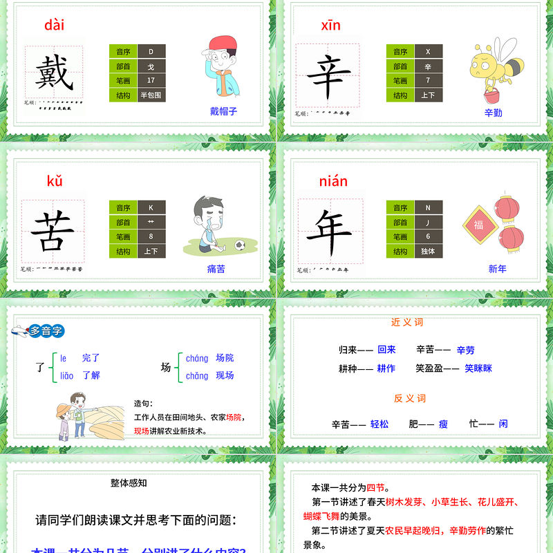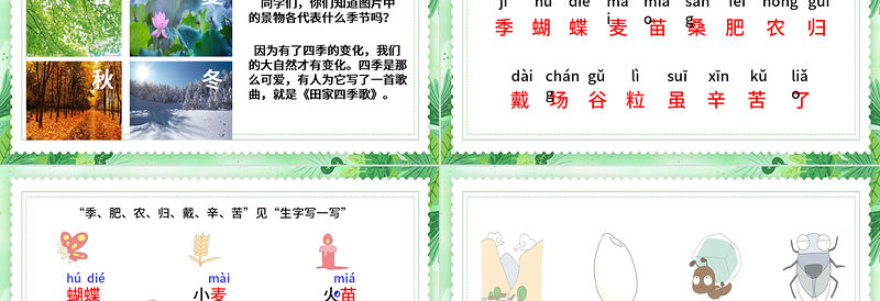 本課一共分為四節。 第一節講述了春天樹木發芽、小草生長、花兒盛開、蝴蝶飛舞的美景。 第二節講述了夏天農民早起晚歸,辛勤勞作的繁忙景象。 第三節描繪了秋天稻子豐收的畫面。 第四節描述了隆冬時節,人們豐衣足食、悠閑過冬的美好畫面。