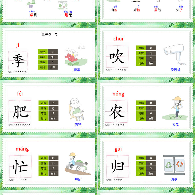 蝴蝶hú dié小麥mài火苗miáo桑樹sāng一場雨cháng“季、肥、農、歸、戴、辛、苦”見“生字寫一寫”