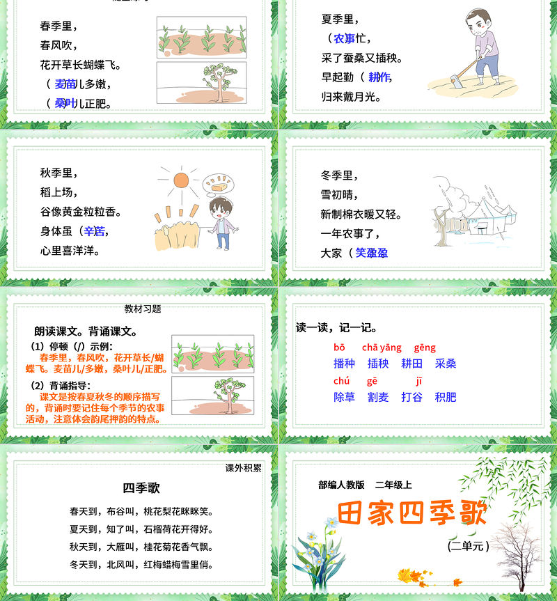 朗讀課文。背誦課文。教材習題(1)停頓(/)示例:春季里,春風吹,花開草長/蝴蝶飛。麥苗兒/多嫩,桑葉兒/正肥。(2)背誦指導:課文是按春夏秋冬的順序描寫的,背誦時要記住每個季節的農事活動,注意體會韻尾押韻的特點。