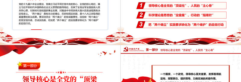 一個國家、一個政黨,領導核心至關重要,發揮著領航定向、凝聚群眾、組織領導、力挽狂瀾的關鍵作用。確立習近平同志黨中央的核心、全黨的核心地位,全黨就有了“頂梁柱”,全國人民就有了“主心骨”。第一部分領導核心是全黨的“頂梁柱”、人民的“主心骨”