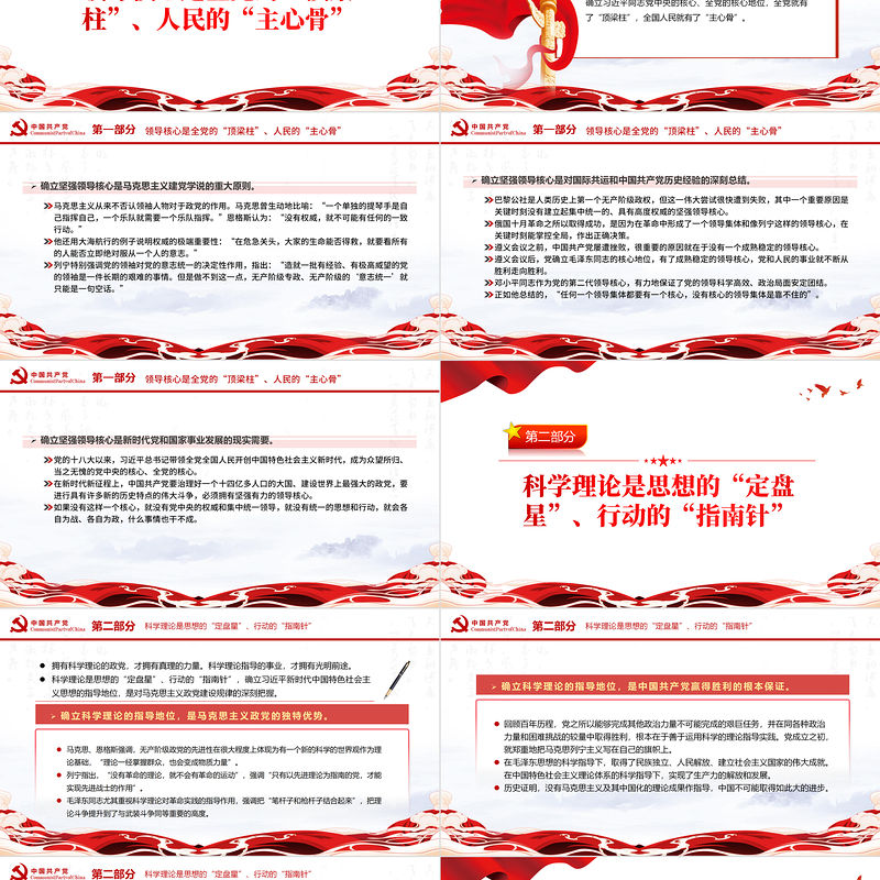 第一部分巴黎公社是人類歷史上第一個無產階級政權,但這一偉大嘗試很快遭到失敗,其中一個重要原因是關鍵時刻沒有建立起集中統一的、具有高度權威的堅強領導核心。俄國十月革命之所以取得成功,是因為在革命中形成了一個領導集體和像列寧這樣的領導核心,在關鍵時刻能掌控全局,作出正確決策。遵義會議之前,中國共產黨屢遭挫敗,很重要的原因就在于沒有一個成熟穩定的領導核心。遵義會議后,黨確立毛澤東同志的核心地位,有了成熟穩定的領導核心,黨和人民的事業就不斷從勝利走向勝利。鄧小平同志作為黨的第二代領導核心,有力地保證了黨的領導科學高效、政治局面安定團結。正如他總結的,“任何一個領導集體都要有一個核心,沒有核心的領導集體是靠不住的”。領導核心是全黨的“頂梁柱”、人民的“主心骨”