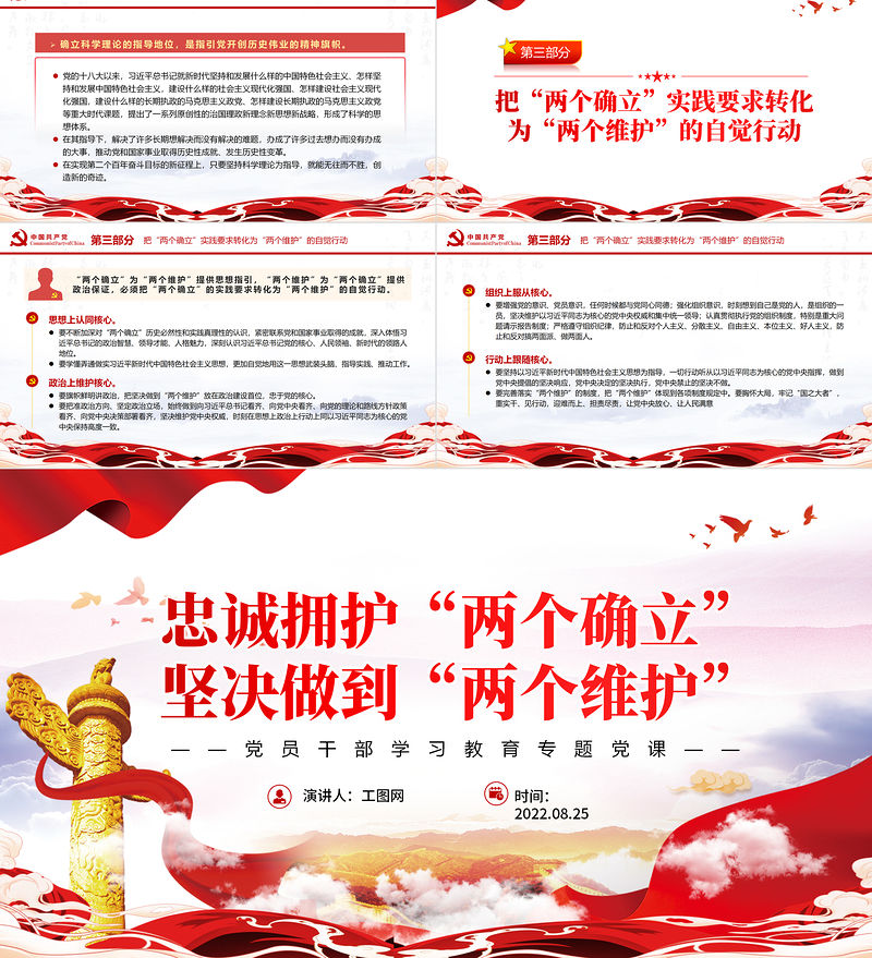 演講人:工圖網時間:2022.08.25忠誠擁護“兩個確立”堅決做到“兩個維護”——黨員干部學習教育專題黨課——