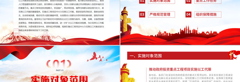 <p>國務院辦公廳轉發國家發展改革委關于在重點工程項目中大力實以工代賑促進當地群眾就業增收工作方案的通知</p><br><p>以工代賑是促進群眾就近就業增收、提高勞動技能的一項重要政策,能為群眾特別是農民工、脫貧人口等規模性提供務工崗位,是完善收入分配制度、支持人民群眾通過勞動增加收入創造幸福生活的重要方式。重點工程項目投資規模大、受益面廣、帶動效應強,吸納當地群眾就業潛力巨大,是實施以工代賑的重要載體。在重點工程項目中大力實施以工代賑,既是促進有效投資、穩就業保民生、拉動縣域消費、穩住經濟大盤的重要舉措,也是推動人民群眾共享改革發展成果、提高勞動者素質的有效手段。要堅持以習近平新時代中國特色社會主義思想為指導,完整、準確、全面貫徹新發展理念,統籌發展和安全,推動高質量發展,進一步擴大以工代賑投資規模,充分發揮以工代賑政策作用。為貫徹落實黨中央、國務院決策部署,現就在重點工程項目中大力實施以工代賑促進當地群眾就業增收制定如下工作方案。前言QIAN YAN</p><br><p>目錄CONTENTS</p><br><p>實施對象范圍01PART-01 </p><br><p>一、實施對象范圍推動政府投資重點工程項目實施以工代賑各地區、各部門在謀劃實施政府投資的重點工程項目時,要妥善處理好工程建設與促進當地群眾就業增收的關系,深刻把握以工代賑政策初衷,在確保工程質量安全和符合進度要求等前提下,按照“應用盡用、能用盡用”的原則,結合當地群眾務工需求,充分挖掘主體工程建設及附屬臨建、工地服務保障、建后管護等方面用工潛力,在平衡好建筑行業勞動合同制用工和以工代賑勞務用工之間關系的基礎上,盡可能多地通過實施以工代賑幫助當地群眾就近務工實現就業增收。鼓勵非政府投資的重點工程項目積極采取以工代賑方式擴大就業容量。</p><br><p>一、實施對象范圍明確實施以工代賑的建設領域和重點工程項目范圍交通領域水利領域農業農村領域城鎮建設領域生態環境領域災后恢復重建領域主要包括高速鐵路、普速鐵路、城際和市域(郊)鐵路、城市軌道交通,高速公路、沿邊抵邊公路,港航設施,機場,綜合交通和物流樞紐等。主要包括水庫建設、大中型灌區新建和配套改造、江河防洪治理等。能源領域主要包括電力、油氣管道、可再生能源等。主要包括高標準農田、現代農業產業園等產業基礎設施、農村人居環境整治提升、農業面源污染治理等。主要包括城市更新、城市地下綜合管廊、城市排水防澇、城市燃氣管道等老化更新改造、保障性住房、縣城補短板強弱項、產業園區配套基礎設施、城鎮污水垃圾處理設施、教育衛生文化體育旅游公共服務項目等。主要包括造林綠化、沙化土地治理、退化草原治理、水土流失和石漠化綜合治理、河湖和濕地保護修復、森林質量精準提升、水生態修復等。主要包括基礎設施恢復和加固、生產條件恢復、生活環境恢復等。發展改革部門要會同相關部門深入研究制定各領域重點工程項目中能夠實施以工代賑的建設任務和用工環節指導目錄</p><br><p>重點工作任務02PART-02</p><br><p>二、重點工作任務形成以工代賑年度重點項目清單國務院教育、生態環境、住房城鄉建設、交通運輸、水利、農業農村、文化和旅游、衛生健康、體育、能源、林草、鄉村振興等相關部門要會同發展改革部門根據國家中長期發展規劃、專項規劃,綜合考慮工程項目特點、當地群眾務工需求等,在國家層面列出適用以工代賑的重點工程項目,分領域形成年度項目清單,指導地方建立本地區適用以工代賑的項目清單,實行動態管理。各地區、各部門要在2022年啟動建設的重點工程項目中,圍繞適合人工作業、勞動密集型的建設任務和用工環節,抓緊組織實施以工代賑。</p><br><p>二、重點工作任務以縣域為主組織動員當地群眾參與重點工程項目業主單位、施工單位要根據能夠實施以工代賑建設任務和用工環節的勞務需求,明確項目所在縣域內可提供的就業崗位、數量、時間及勞動技能要求,并向相關縣級人民政府告知用工計劃。項目所在地縣級人民政府要與業主單位、施工單位建立勞務溝通協調機制,及時開展政策宣講和勞動力狀況摸底調查,組織動員當地農村勞動力、城鎮低收入人口和就業困難群體等參與務工,優先吸納返鄉農民工、脫貧人口、防止返貧監測對象。培育壯大勞務公司、勞務合作社、村集體經濟組織等,提高當地群眾勞務組織化程度。項目業主單位要督促指導施工單位做好以工代賑務工人員合同簽訂、臺賬登記、日常考勤等實名制管理工作。</p><br><p>二、重點工作任務</p><br><p>二、重點工作任務及時足額發放勞務報酬相關地方人民政府要督促項目施工單位盡量擴充以工代賑就業崗位,合理確定以工代賑勞務報酬標準,盡可能增加勞務報酬發放規模。施工單位要建立統一規范的用工名冊和勞務報酬發放臺賬,經務工人員簽字確認后,原則上將勞務報酬通過銀行卡發放至本人,并將勞務報酬發放臺賬送縣級相關部門備案。堅決杜絕勞務報酬發放過程中拖欠克扣、弄虛作假等行為。</p><br><p>嚴格規范管理03PART-03</p><br><p>三、嚴格規范管理項目前期工作明確以工代賑要求重點工程項目可行性研究報告或資金申請報告等要件中,要以適當形式體現能夠實施以工代賑的建設任