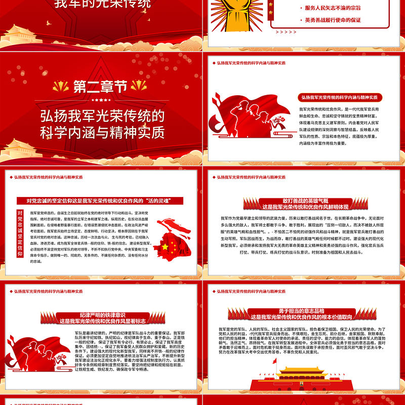 弘揚(yáng)我軍光榮傳統(tǒng)的重要性02、能打勝仗的重要法寶習(xí)主席指出,我們這支軍隊(duì),戰(zhàn)爭年代沒有被殘酷的環(huán)境、強(qiáng)大的敵人打垮,進(jìn)城后沒有被"糖衣炮彈”打垮,靠的就是保持和發(fā)揚(yáng)我軍光榮傳統(tǒng)和優(yōu)良作風(fēng)。歷史昭示我們,大力弘揚(yáng)我軍光榮傳統(tǒng)和優(yōu)良作風(fēng),始終是我軍部隊(duì)勇往直前、無往不勝的看家法寶。建設(shè)強(qiáng)大新型我軍,能打仗是根本指向,打勝仗是現(xiàn)實(shí)考驗(yàn),能否始終如一保持我軍光榮傳統(tǒng)和優(yōu)良作風(fēng),是關(guān)系新型我軍敢戰(zhàn)、能戰(zhàn)、善戰(zhàn)、勝戰(zhàn)的大問題。