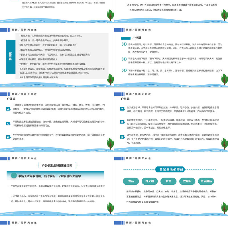 雷雨天記住三避 打傘時記住三忌避免雷電入“樹”(勿在樹、桿等下躲雨)避免雷電入“頂” (勿在山頂、樓頂?shù)雀咛幎毫?避免雷電入“士”(勿觸摸墻上避雷針等金屬)忌選擇金屬把的雨傘忌在電器設(shè)施周圍撐傘忌高處使用雨傘