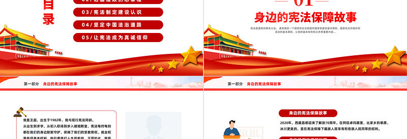 在第五屆全國學生“學憲法 講憲法”活動全國總決賽現場,來自小學、初中、高中和高校4個學段的134名青少年學生,圍繞憲法,從疫情期間國家對人權的保障、民法典、勤儉節約、生態環境保護、入伍參軍、“光盤行動”、垃圾分類等角度進行演講。第一部分 身邊的憲法保障故事