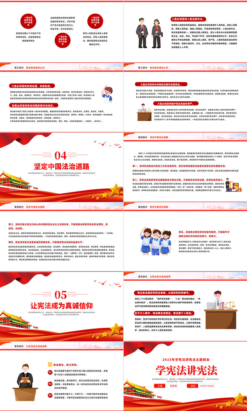 黨的二十大對新時代新征程黨和國家事業發展作出全面部署,強調要更好發揮憲法在治國理政中的重要作用,更好發揮法治固根本、穩預期、利長遠的保障作用,在法治軌道上全面建設社會主義現代化國家。我們要貫徹落實黨的二十大精神,堅定不移走中國特色社會主義法治道路,增強憲法自覺,加強憲法實施,履行憲法使命,譜寫新時代中國憲法實踐新篇章。第四部分 堅定中國法治道路