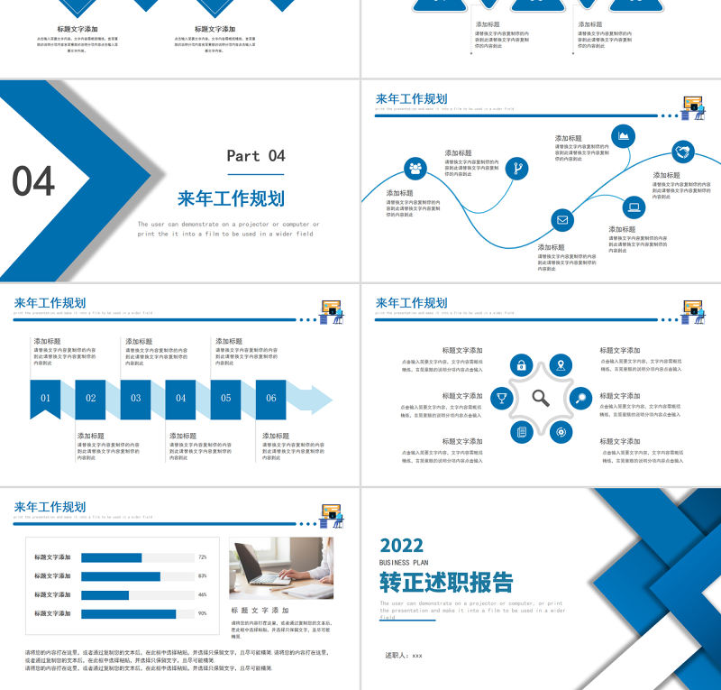 2022實習期轉正述職報告藍色商務簡約試用期工作總結轉正必備PPT模板下載包含