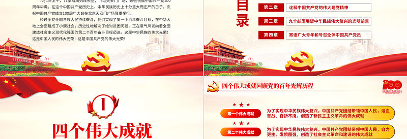第一章第二章第三章第四章四個偉大成就回顧黨的百年光輝歷程詮釋中國共產黨的偉大建黨精神九個必須展望中華民族偉大復興的光明前景寄語廣大青年和號召全體中國共產黨員目錄