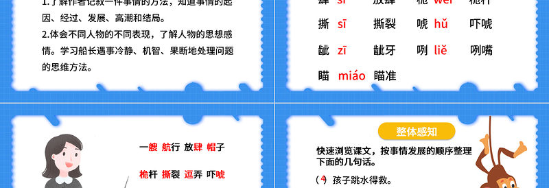 課文總結 本文記敘了一艘帆船的船長在孩子萬分危急的時刻,命令他跳水,使他轉危為安的故事。表現了船長遇事冷靜、臨危不亂的氣度,同時也告訴人們:在事物發展和變化的過程中,要根據情況的變化采取相應的果斷行動。