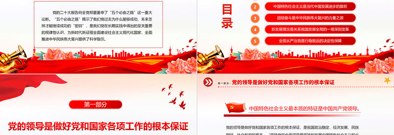 目錄1黨的領導是做好黨和國家各項工作的根本保證2中國特色社會主義是當代中國發展進步的旗幟3團結奮斗是中華民族偉大復興的力量之源4新發展理念是關系我國發展全局的一場深刻變革5全面從嚴治黨是行穩致遠的決定性保障