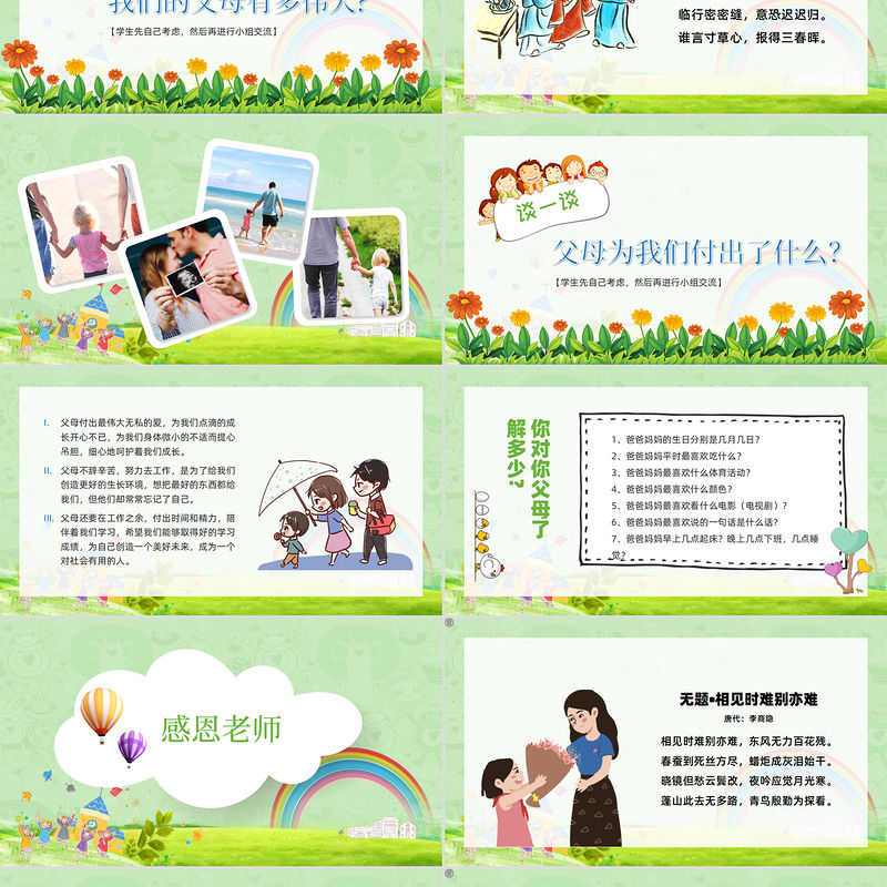 你對你父母了解多少? 1、爸爸媽媽的生日分別是幾月幾日?2、爸爸媽媽平時最喜歡吃什么?3、爸爸媽媽最喜歡什么體育活動?4、爸爸媽媽最喜歡什么顏色?5、爸爸媽媽最喜歡看什么電影(電視劇)?6、爸爸媽媽最喜歡說的一句話是什么話?7、爸爸媽媽早上幾點起床?晚上幾點下班,幾點睡覺?