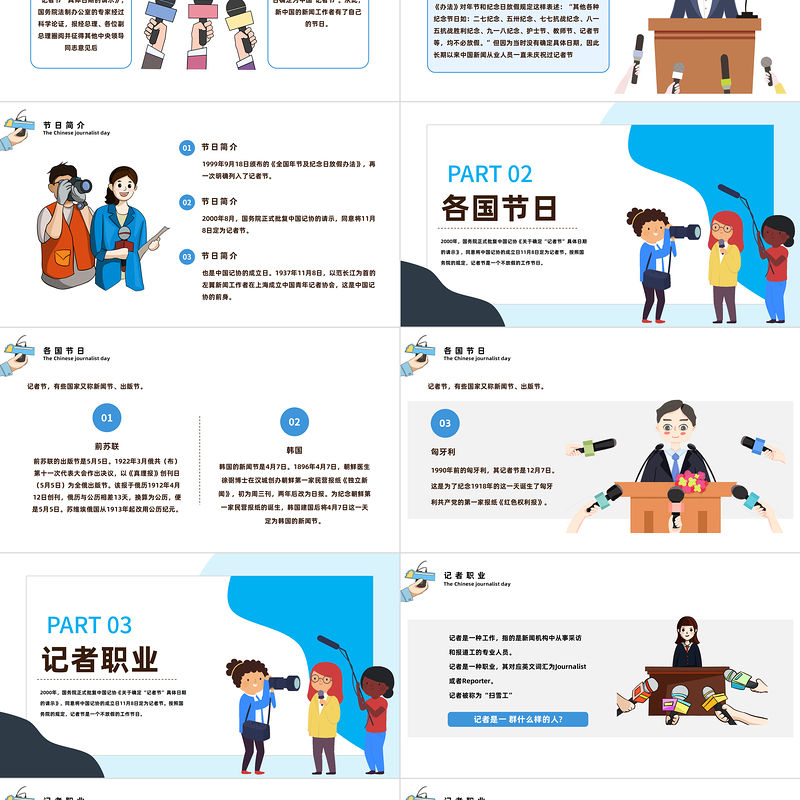 工圖網提供2022中國記者節PPT卡通插畫風中國記者節日科普主題班會課件模板下載供會員免費下載。更多精彩黨課PPT素材,盡在工圖網。