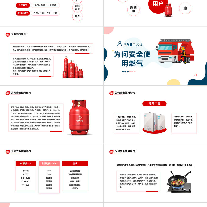 可燃氣體的爆炸極限爆炸極限:可燃氣體在空氣中達到一定濃度,會形成爆炸性氣氛,遇明火就會產生爆炸。天然氣:5~15%;人工煤氣:5~50%液化石油氣:1.7~9.7%造成泄漏的原因—室內燃氣管道及其附件(燃氣閥、煤氣表、軟管等)連接處有泄漏—家用灶、熱水器的氣密性不符合要求;燃氣設施常維護 隱患事故藏不住,中毒事故煤氣中毒事故一般都是因為一氧化碳中毒,人維持生命所需的氧氣通過呼吸運動進入人的肺,在肺泡里與血液中的血紅蛋白結合,經血液循環系統送到全身。為何安全使用燃氣