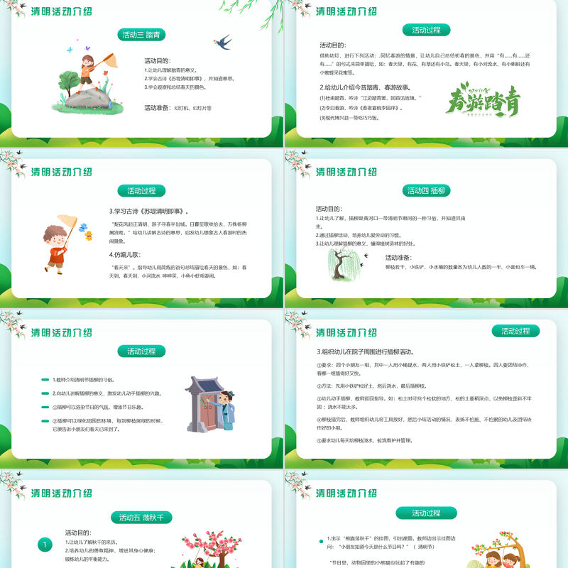 清明活動介紹活動三 踏青活動目的:1.讓幼兒理解踏青的意義。2.學會古詩《蘇堤清明即事》,并知道意思。3.學會觀察和總結春天的景色。活動準備:幻燈機、幻燈片等
