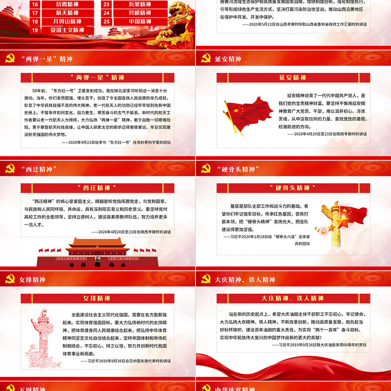 延安精神 延安精神培育了一代代中國共產黨人,是我們黨的寶貴精神財富。要堅持不懈用延安精神教育廣大黨員、干部,用以滋養初心、淬煉靈魂,從中汲取信仰的力量、查找黨性的差距、校準前進的方向。——2020年4月20日至23日在陜西考察時的講話