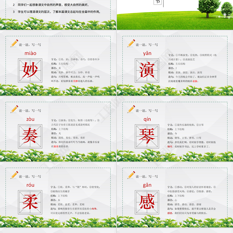 本節課會認識8個新生字,會寫出13個生字,可以掌握本節課的多音字,最后可以正確讀寫“美妙、演奏”等詞語。 同學們一起想象課文中自然的聲音,感受大自然的美好。 學生可以理清課文的層次,了解本篇課文總起句在全篇中的作用。