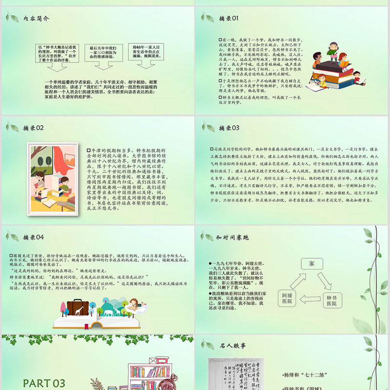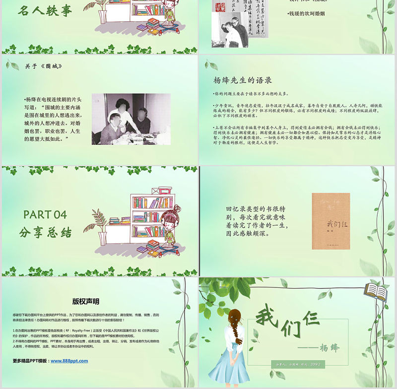 工圖網提供小清新綠葉語文課件我們仨讀書報告讀書分享PPT模版供會員免費下載。更多精彩黨課PPT素材,盡在工圖網。