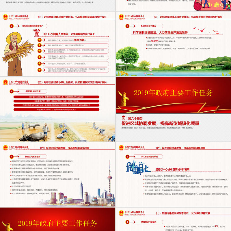 2019年政府主要工作任務(wù)對標(biāo)全面建成小康社會任務(wù)扎實(shí)推進(jìn)脫貧攻堅(jiān)和鄉(xiāng)村振興堅(jiān)持農(nóng)業(yè)農(nóng)村優(yōu)先發(fā)展,加強(qiáng)脫貧攻堅(jiān)與鄉(xiāng)村振興統(tǒng)籌銜接,確保如期實(shí)現(xiàn)脫貧攻堅(jiān)目標(biāo)、農(nóng)民生活達(dá)到全面小康水平。
