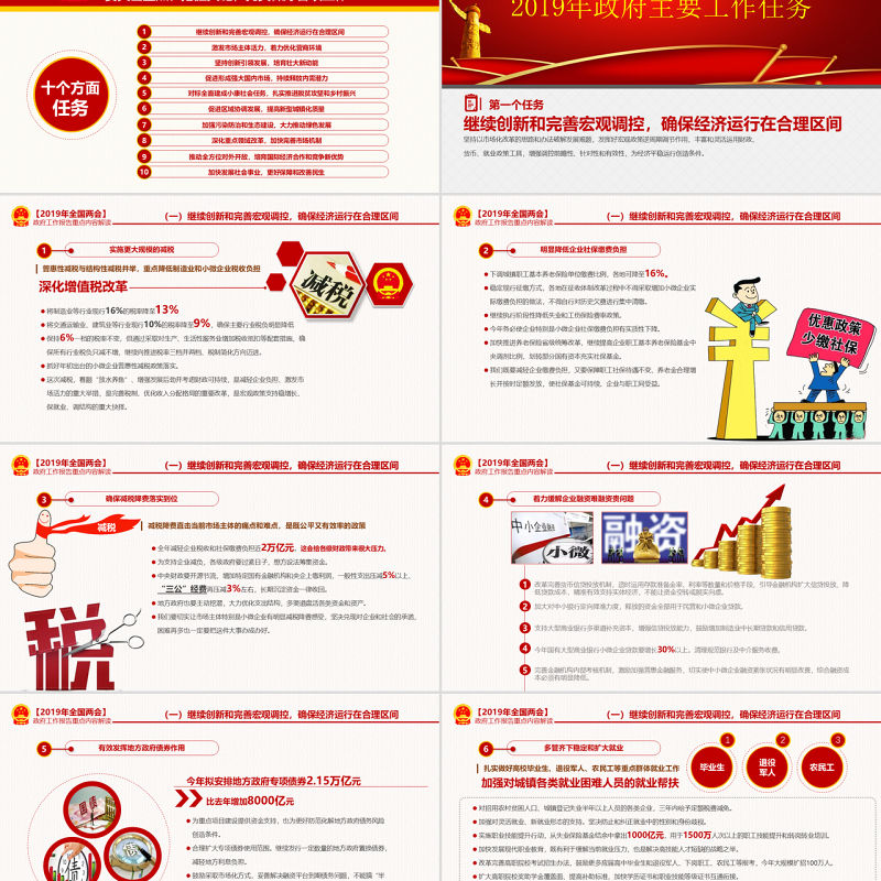 2019年政府工作任務(wù)要突出重點(diǎn)、把握關(guān)鍵,扎實(shí)做好各項(xiàng)工作十個方面任務(wù)繼續(xù)創(chuàng)新和完善宏觀調(diào)控,確保經(jīng)濟(jì)運(yùn)行在合理區(qū)間激發(fā)市場主體活力,著力優(yōu)化營商環(huán)境堅(jiān)持創(chuàng)新引領(lǐng)發(fā)展,培育壯大新動能促進(jìn)形成強(qiáng)大國內(nèi)市場,持續(xù)釋放內(nèi)需潛力對標(biāo)全面建成小康社會任務(wù),扎實(shí)推進(jìn)脫貧攻堅(jiān)和鄉(xiāng)村振興促進(jìn)區(qū)域協(xié)調(diào)發(fā)展,提高新型城鎮(zhèn)化質(zhì)量加強(qiáng)污染防治和生態(tài)建設(shè),大力推動綠色發(fā)展深化重點(diǎn)領(lǐng)域改革,加快完善市場機(jī)制推動全方位對外開放,培育國際經(jīng)濟(jì)合作和競爭新優(yōu)勢加快發(fā)展社會事業(yè),更好保障和改善民生